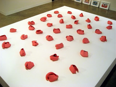 Louise Bourgeois, with her long life of artmaking, is art history. Lynda Benglis, at least 30 years younger than Bourgeois, has moved into that realm with her ceaseless exploration of materials. And Hannah Wilke (1940-1993), who used her body transgressively to flaunt sexist ideas and taunt sexist thinking, has moved into that realm as well. Indeed, when I first saw the pink labias at the Alison Jacques Gallery at the big fair, I thought, "Some is ripping off Hannah Wilke!" I need not have worried. The gallery dedicated most of the booth to Wilke's work. .