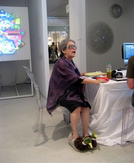 . . . but you'd have to rip them off the feet of Bernice Steinbaum, photographed here in her booth at Art Miami. She may have her gallery in Wynwood now, but she's a New Yorker; you wouldn't stand a chance