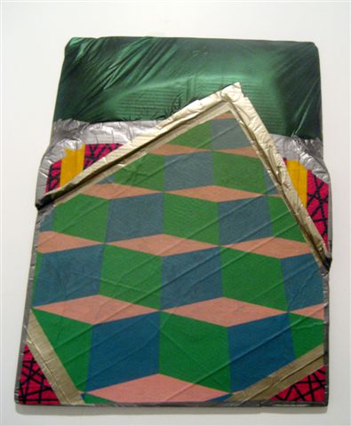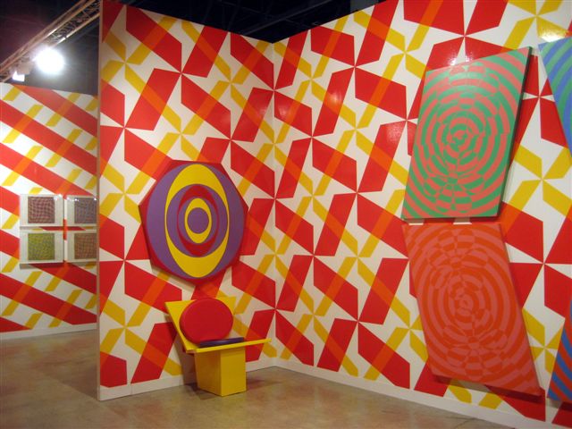 These walls provide their own hallucinogenic moments. Isserman, above, created a vinyl op pattern specifically for his installation at ABMB, replete with the wooze-inducing canvases. Trenton Doyle Hancock, below, printed a 3-D pattern in fluorescent inks--and when you put on the glasses, the red explodes off the wall. Olek, bottommost image of the three, created an entire crocheted apartment