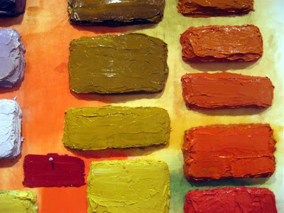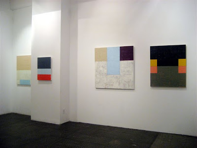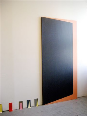 I didn't want to take up all of Schifano's studio time on this afternoon. She works four days a week as a painting conservator, so studio time is precious. I thanked her (taking, with her good wishes, the rest of the salty chocolate bar she'd put out during our conversation). This is the view of the way out, below: A third elongated painting on the viewing wall and a cogent definition of space via the small wall/floor piece.