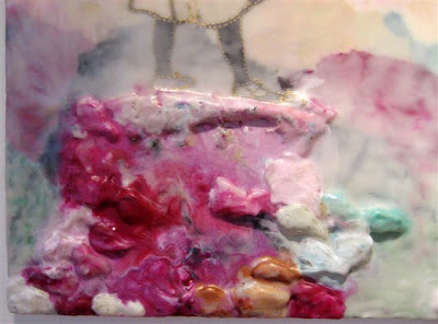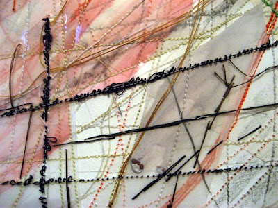 Since I talked about materiality, I've got a detail from each artist. Chong, above, in fact serves up substantial passages of abstraction within her narratives. Just above the chunky corner (shown in full view just above the detail) is the outline of a figure with legs and skirt. The staccato line suggests stitching, which leads us to . . .