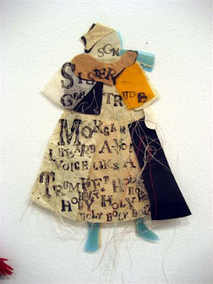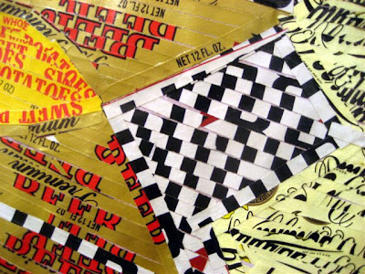 At Arthur Roger Gallery, New Orleans: Troy Dugas quiltlike assemblages. Sunflower, foreground, is made from shredded labels mounted to paper