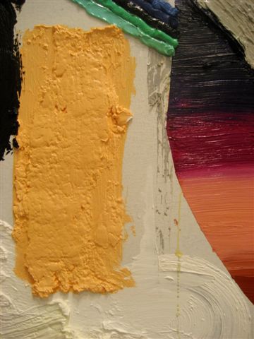 Since we're knee deep in texture, let's continue in that vein. Normally I'm not a fan of glop art; I like a little more restraint with my paint. But allow me to eat some oil here. I love these paintings by Trudy Benson. I'm not sure why, because she's of the slather-and-caulk school of painting, but they work for me. In fact, I liked them so much I'm showing you two, each with a detail.