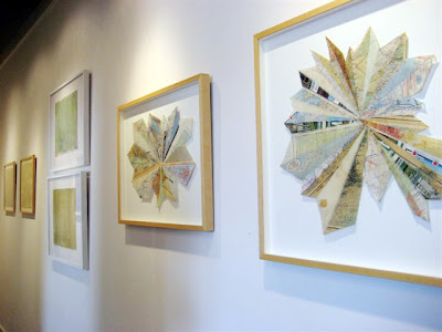 Installation views, above and below: Stepping out of the gallery and around the corner, we come to Moriarty's works on paper, waxed map shards that are collaged and pinned. Farther down the wall you glimpse Farrell's and Mason's monoprints